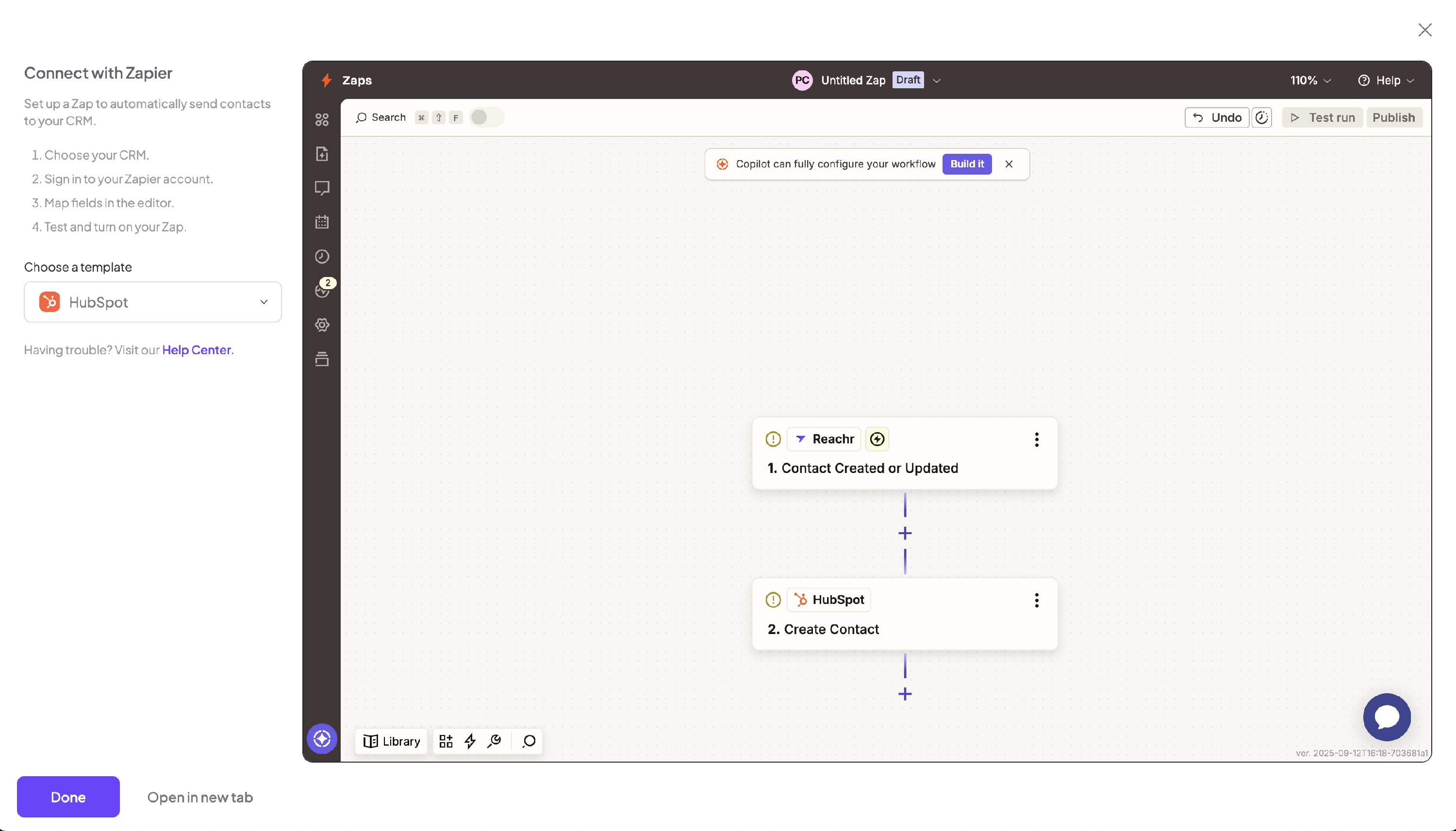 - A Zapier window will open with a Reachr → HubSpot template already filled out: